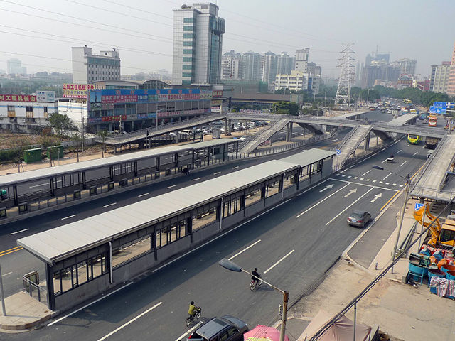 広州市民は、BRTにより渋滞が緩和されることを期待していますが、瓶頸(ボトルネック)と言われているのは、2カ所ある立体高架です。それぞれ崗頂と師大曁大間、師大曁大と華景新城間の高架ですが、この部分は、4車線が急に2車線になるので、ラッシュアワー時は頻繁に渋滞します。この立体高架にもBRT車両専用道を設けるらしいですが、効果のほどはいかに?