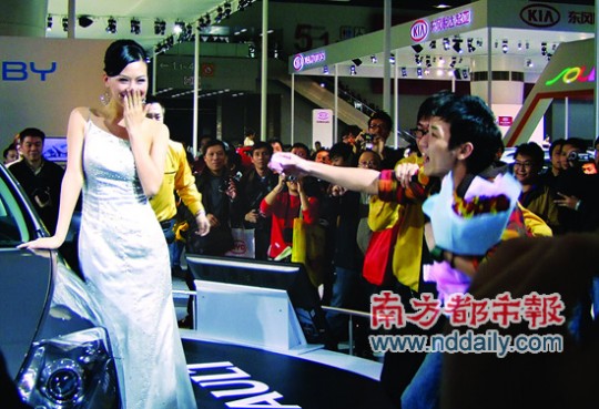 広州の各新聞は、2009年広州モーターショーの話題で持ちきりですが、その中に展示台上のコンパニオンに突然プロポーズした若者の記事がありました。