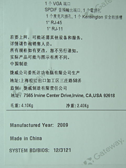 中国でノートPC購入 Gateway NV4412c